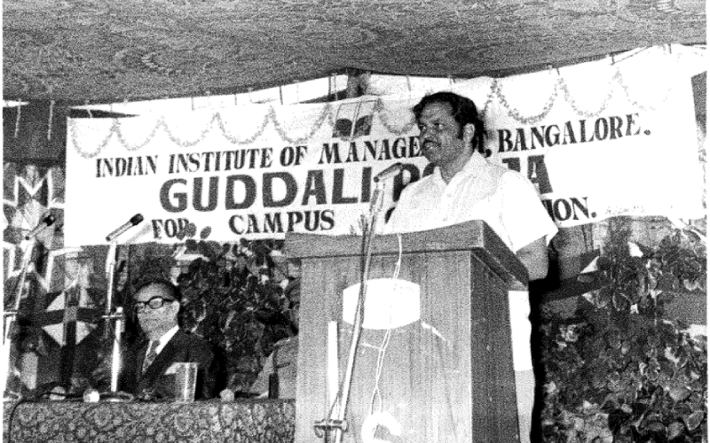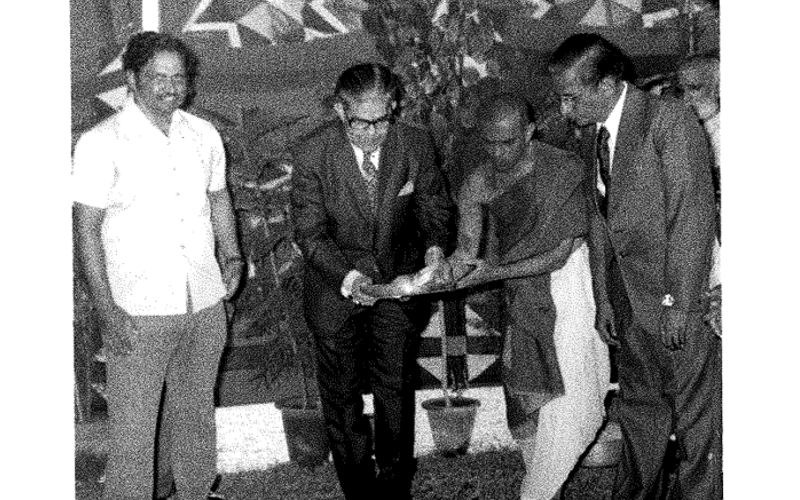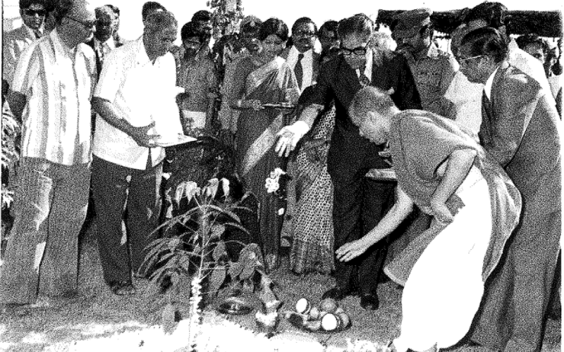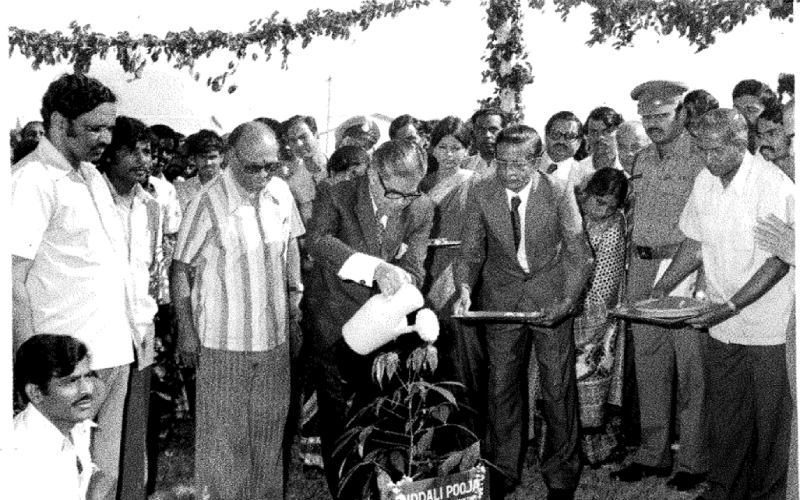 Karnataka Governor Shri Govind Narain at the Ground-breaking ceremony of the Bannerghatta Road Campus on 27th November 1978. Prof. S. Subba Rao, Director-in-charge looks on