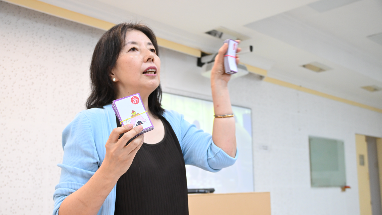 The workshop's energy peaked during a game of Karuta, a traditional Japanese card game that tests listening skills, memory, and reflexes. As phrases were read aloud, participants enthusiastically competed to identify and grab the corresponding cards. The room was filled with laughter and competitive spirit as players engaged in the fast-paced and enjoyable activity.